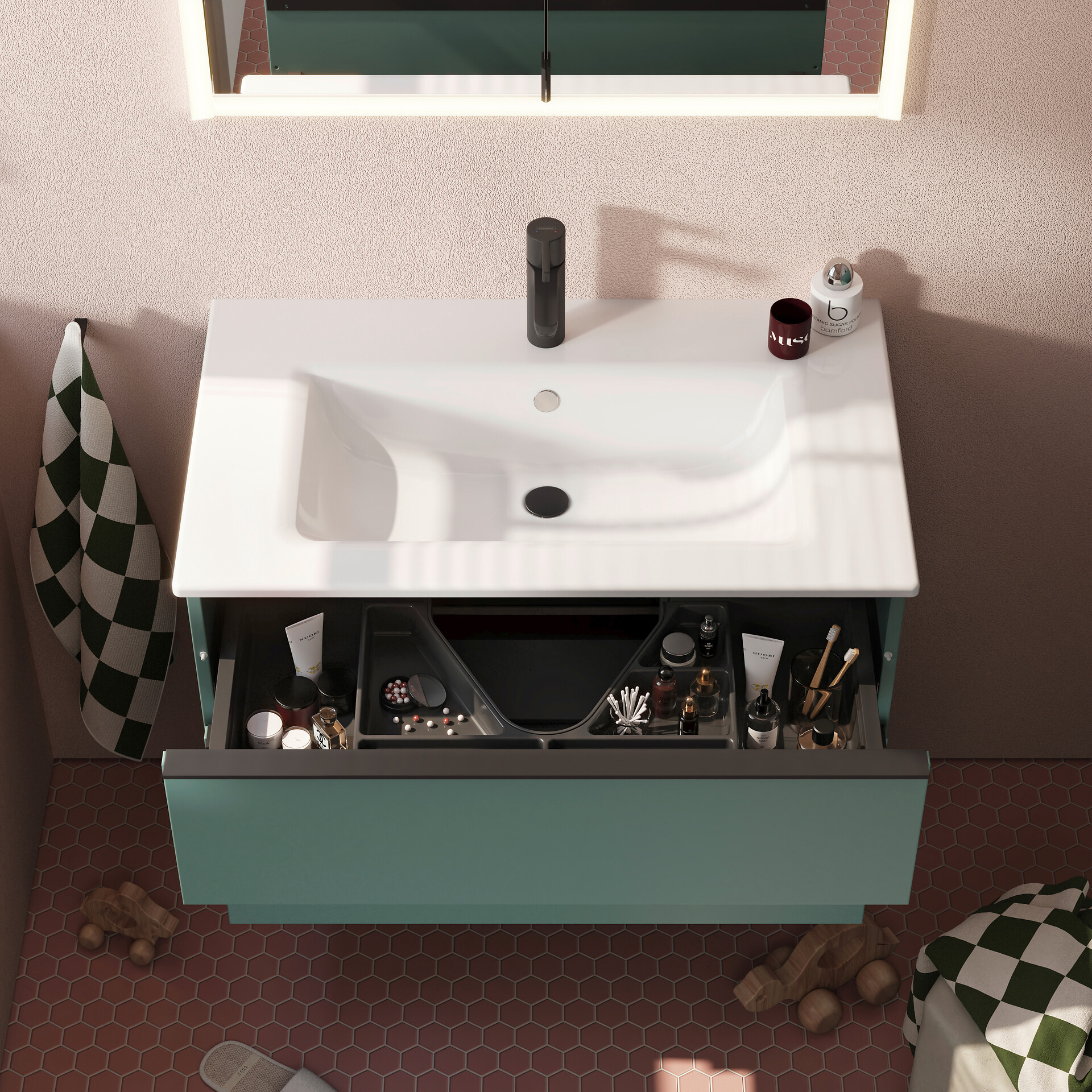 Zusammen mit Unterschrank und Spiegel beziehungsweise Spiegelschrank bildet das Waschtischensemble das Zentrum jedes Badezimmers. Mit hellen und freundlichen Tönen arbeitende Farbkonzepte zur harmonischen Raumwirkung, mit Spiegelflächen und einer Verteilung der Lichtquellen auf unterschiedlichen Ebenen kann der Längsdehnung schlauchförmiger Räume entgegengewirkt werden, und kleine Bäder erscheinen so luftiger und großzügiger.